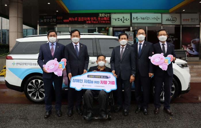 지난 8일, 한마음장애인자립생활센터에서 진행된 13번째 어부바 차량 전달식에는 김성주 신협행복나눔부문장, 김삼호 광산구청장, 김동효 한마음장애인자립생활센터 소장을 비롯하여 김춘석 신협중앙회 이사, 이기남 신협광주지역협의회장, 이문규 신협광주전남지역본부장 등이 참석했다.
