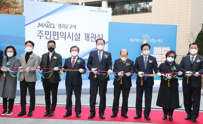 유동균 서울 마포구청장은 22일 ‘염리2구역 주민편익시설(염리동 61-4)’ 개관식에 참석했다. 염리2구역 주민편익시설은 염리어린이집, 소금나루도서관, 총 118면의 공영주차장 등이 함께 조성된 주민의 교육과 보육, 생활편의를 고려한 복합시설이다. 사진은 개관식에 참석한 유 구청장(가운데)이 관계자들과 테이프 커팅을 하는 모습. (사진제공=마포구청)