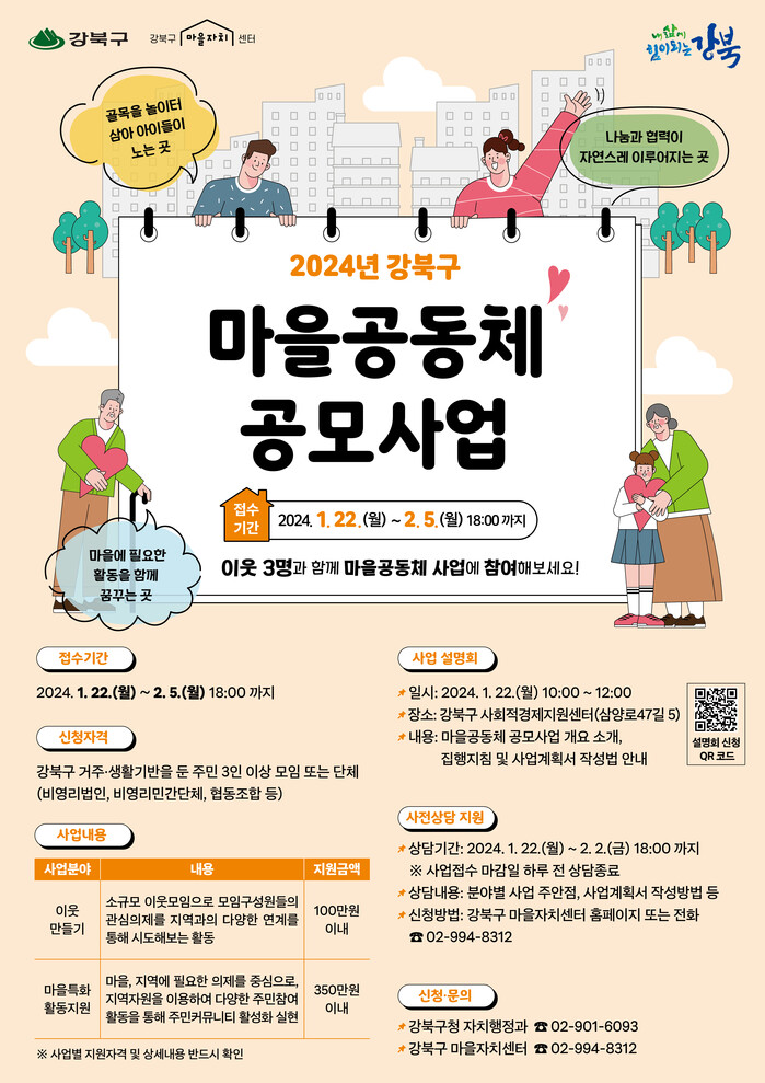 [시민일보 = 홍덕표 기자] 서울 강북구(구청장 이순희)는 ‘2024년 강북구 마을공동체 공모사업’을 위한 설명회를 오는 22일 오전 10시~낮 12시 ‘사회적경제지원센터(삼양동 소재)’ 4층 커뮤니티홀에서 개최한다.
