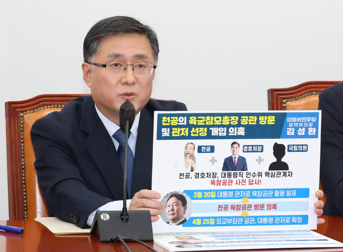 그는 이어 "천공은 윤석열 대통령 당선 직후부터 대통령 집무실 이전에 개입한 것으로 보인다"며 "윤 대통령이 당선된 직후 당초 공약과 관계없이 청와대를 용산으로 옮기겠다고 고집했는데 예산이 허용되지 않자 (천공은)윤 대통령이 국방부 앞에 천막을 치고 있는 것이라고 강연했고, 그 다음날 윤 대통령이 야전 천막을 치더라도 청와대를 국민께 돌려드리겠다고 거의 같은 말을 한다"고 지적했다.