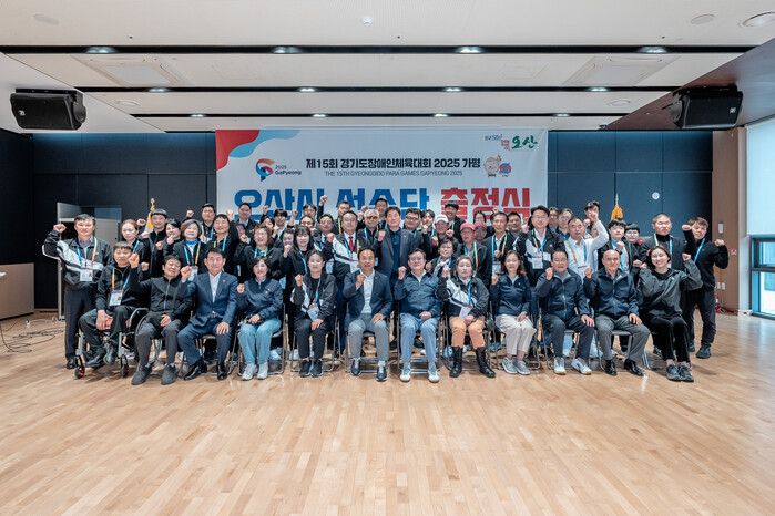 경기 오산시 장애인체육회가 최근 오색문화체육센터에서 ‘제15회 경기도장애인체육대회 2025 가평’ 선수단 출정식 열었다. 선수단은 이번 대회에서 게이트볼, 당구, 론볼, 볼링, 역도, 탁구, 파크골프 등 총 7개 종목에 출전한다. 본 대회는 24일부터 26일까지 가평 자라섬 중도에서 열린다. 사진은 출정식에서 이권재 시장(앞줄 여섯 번째)이 관계자들과 기념 촬영을 하는 모습. (사진=오산시청 제공)