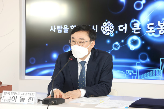 한국인권도시협의회는 21일 영상회의를 통해 전국 지방정부 회원도시 단체장과 2022년 제1차 정기총회를 개최했다. 이번 정기총회에서는 각 지역 인권증진 유공자에 대한 표창과 2021년 사업 추진 보고 및 결산 승인 등을 진행했다. 사진은 협의회 회장인 이동진 도봉구청장이 정기총회를 진행하는 모습. (사진제공=도봉구청)