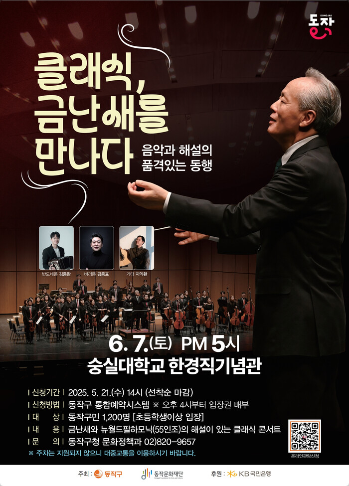 [시민일보 = 여영준 기자] 서울 동작구(구청장 박일하)는 오는 6월7일 오후 5시 숭실대학교 한경직기념관에서 세계적인 지휘자 금난새와 함께하는 ‘클래식 오케스트라 음악회’를 개최한다고 21일 밝혔다.