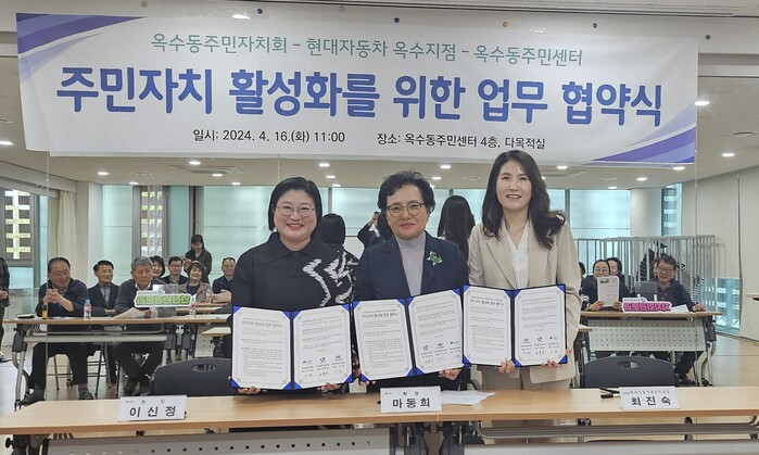 [시민일보 = 이대우 기자] 서울 성동구(구청장 정원오) 옥수동은 지난 16일 동 주민자치회 및 현대자동차 옥수지점과 함께 주민자치 활성화를 위한 업무협약을 체결했다.