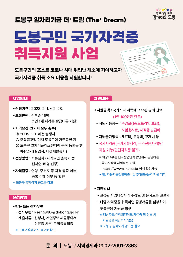 | ▲ ‘도봉구민 국가자격증 취득지원 사업’ 홍보 포스터 (사진=도봉구청 제공) |