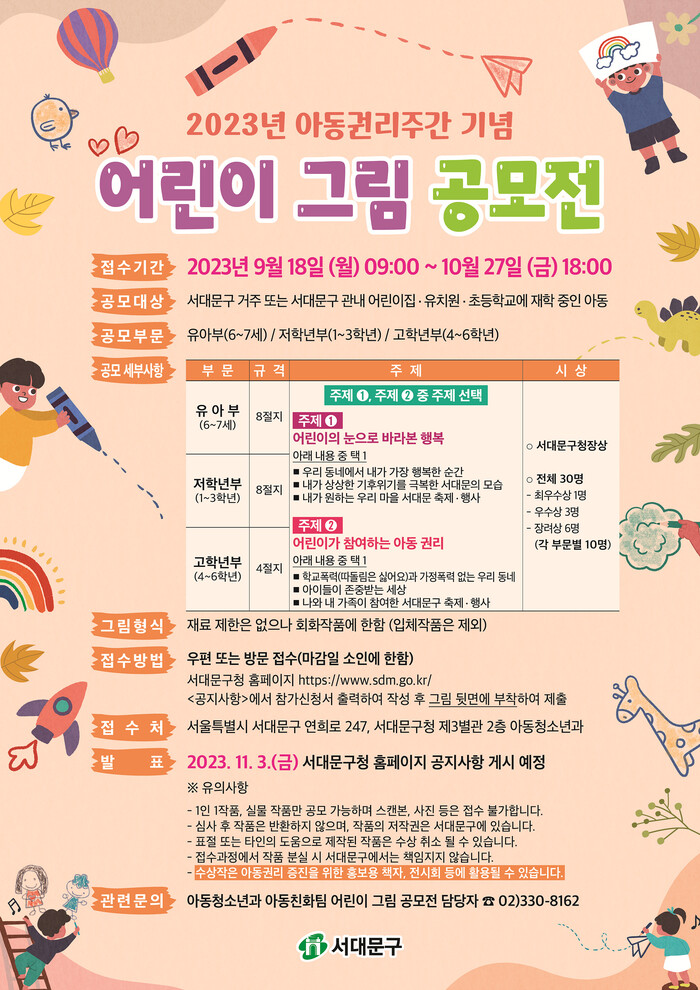 [시민일보 = 홍덕표 기자] 서울 서대문구(구청장 이성헌)가 11월 셋째 주 아동권리주간을 기념하기 위해 10월 27일까지 ‘2023 아동권리주간 기념 어린이 그림 공모전’을 연다.