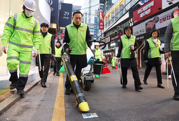 | ▲ 강남역 여명길에서 노면 청소기로 불법전단지를 청소하는 조성명 강남구청장 (사진=강남구청 제공) |