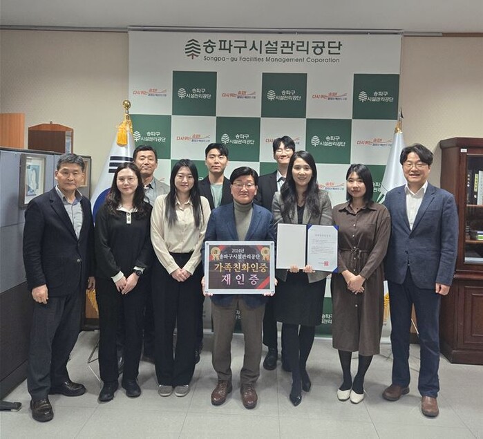 [시민일보 = 이대우 기자] 송파구시설관리공단(이사장 황대성)은 여성가족부에서 주관하고 한국경영인증원에서 심사한 가족친화인증기관 재인증 심사를 통과하여 2024. 12. 1.~2027. 11. 30.까지 가족친화기관으로 인증받았다고 밝혔다.