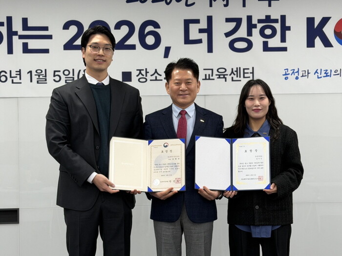 | 남태욱 성장협력실장(왼쪽부터), 엄진엽 원장, 장지은 인증지원실 사원이 ‘2025년도 우수 직원 포상’ 시상식 후 함께 기념촬영을 하고 있다. [사진=중소벤처기업인증원] |