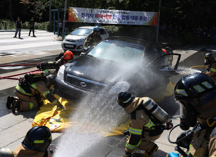 28일 오전 서울 성동구 왕십리광장에서 성동소방서 소방대원들이 아파트 주차장 전기차 화재 발생 상황을 가정해 열린 대응 훈련에서 포켓식 수조 설치를 통해 진화하고 있다.