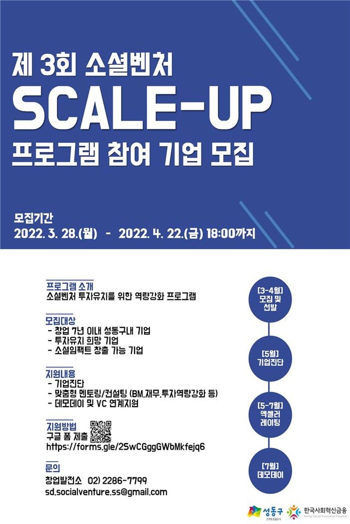 | ▲ 제3회 소셜벤처 '스케일-업' 프로그램 참여 기업 모집 안내문. (사진제공=성동구청) |