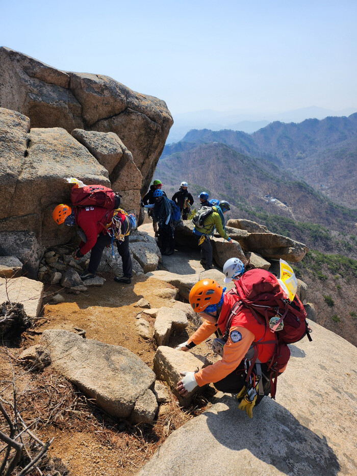 6일 서울 강북구 북한산 만경대 일대에서 북한산국립공원사무소 관계자와 국립공원 산악안전단 소속 회원들이 낙석 안전 점검을 하고 있다.