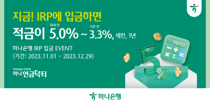 [시민일보 = 여영준 기자] 하나은행은 개인형IRP 손님을 대상으로 오는 12월29일까지 '지금! IRP에 입금하면 적금이 최대 세전 연 5.0%(기본금리 세전 연 3.3%, 1년제)' 퇴직연금 이벤트를 시행한다고 23일 밝혔다.