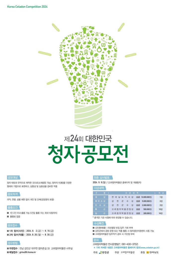 강진원 강진군수는 “국내 유일의 청자공모전으로 벌써 24회를 맞이한 만큼 그동안 수준 높은 작품들이 다수 출품돼 그 권위가 널리 알려져 있다”며 “도자문화를 계승하고 발전시키기 위해 끊임없이 노력하는 도예 작가들의 많은 관심과 참여를 바란다.”고 말했다.