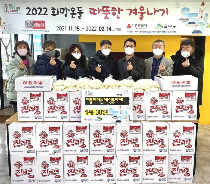서울 은평구 응암1동 주민센터는 최근 설명절을 맞아 더불어사는세상 봉사대로부터 떡국떡과 라면 등이 담긴 식료품 30세트 식료품 전달받았다. 사진은 이날 관계자들이 기념촬영을 하는 모습. (사진제공=은평구청)