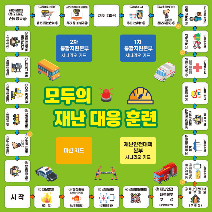 재난 발생 초기부터 복구까지 대응 절차를 총 25단계로 나눠 스토리보드 게임 형태로 구현된 이 프로그램은 8명이 한팀을 이뤄 재난안전대책본부의 각 실무반 역할을 맡는다. 각 재난 상황의 단계마다 미션 카드를 열어 자신이 맡은 역할에 따라 재난 대응을 하면 말판을 이동시킬 수 있다.