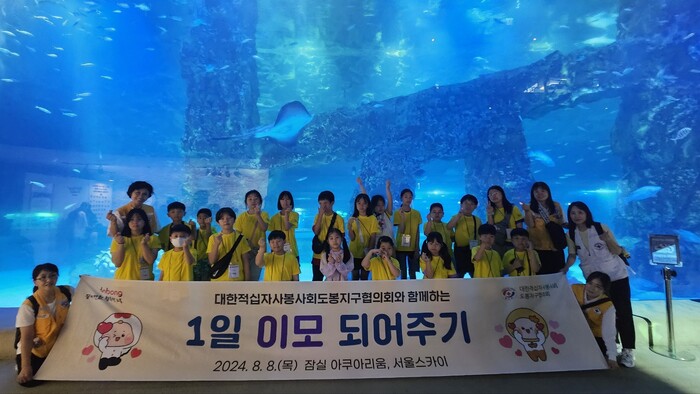 도봉구는 지난 8일 도봉지구협의회와 함께 지역내 아동·청소년을 대상으로 ‘1일 이모 되어주기 봉사’를 실시해 아쿠아리움, 서울스카이 등을 방문하는 등 다양한 문화체험활동을 즐겼다. 사진은 아쿠아리움 관람 후 단체사진을 찍고 있는 지역내 아동·청소년들의 모습. (사진=도봉구청 제공)