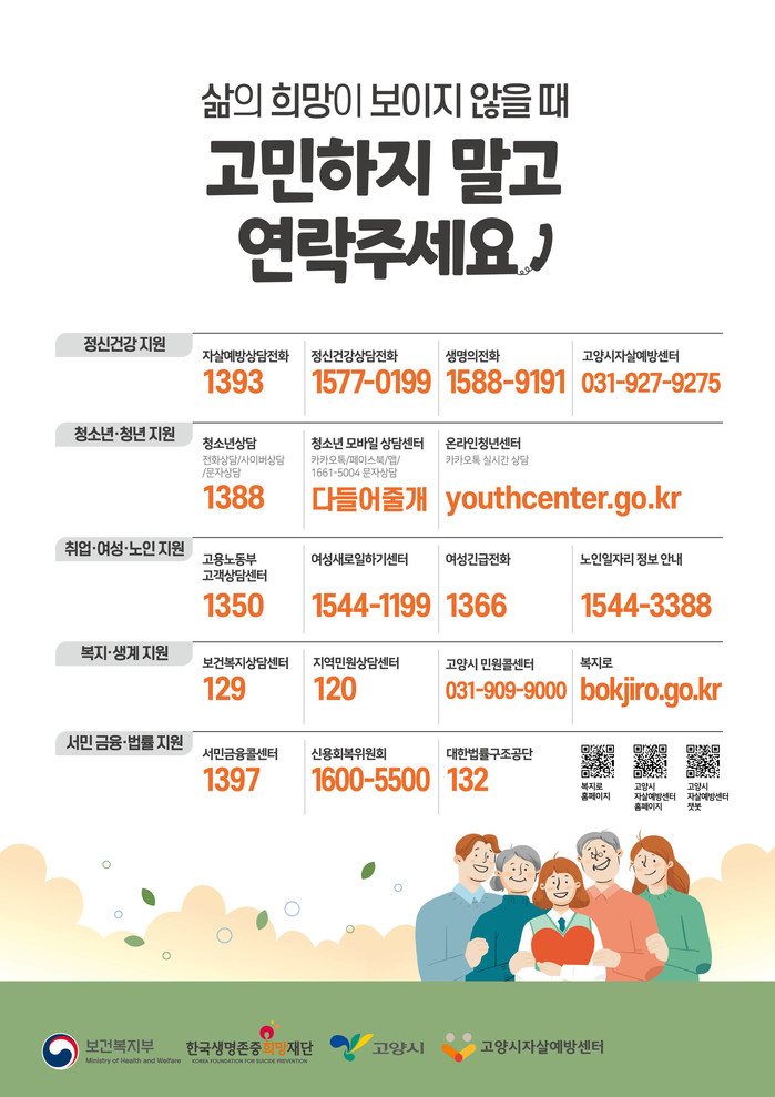 한편, 고양시자살예방센터는 2019년 2월 개소하여 고양시민의 자살예방을 위한 무료상담과 자살예방교육, 생명사랑공모전 등 다양한 사업을 실시해 잠재적 자살고위험군을 지원하고 있다.