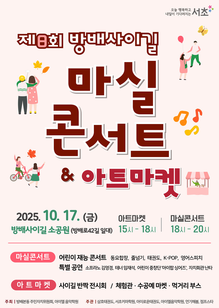 [시민일보 = 박소진 기자] 서초구(구청장 전성수)는 17일 방배로42길에 위치한 방배사이길 소공원에서 ‘제8회 방배사이길 마실콘서트&아트마켓’을 개최한다.