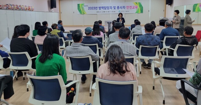 교육의 주요내용으로는 23년 방역소독사업 추진방향과 방역장비사용법, 소독 및 살충약품의 안전한 사용요령 등 기타 근로자 안전교육 등이며 지난달 정비를 완료한 방역소독장비 배부해 현장에서 실습하는 시간도 가졌다.