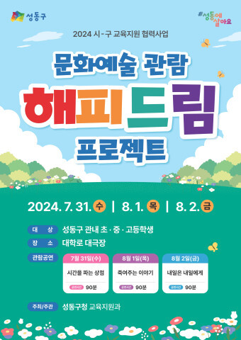 [시민일보 = 이대우 기자] 서울 성동구(구청장 정원오)는 여름방학을 맞아 관내 취약계층 청소년에게 다양한 문화체험의 기회를 제공하기 위해 '해피드림 프로그램'을 진행한다.