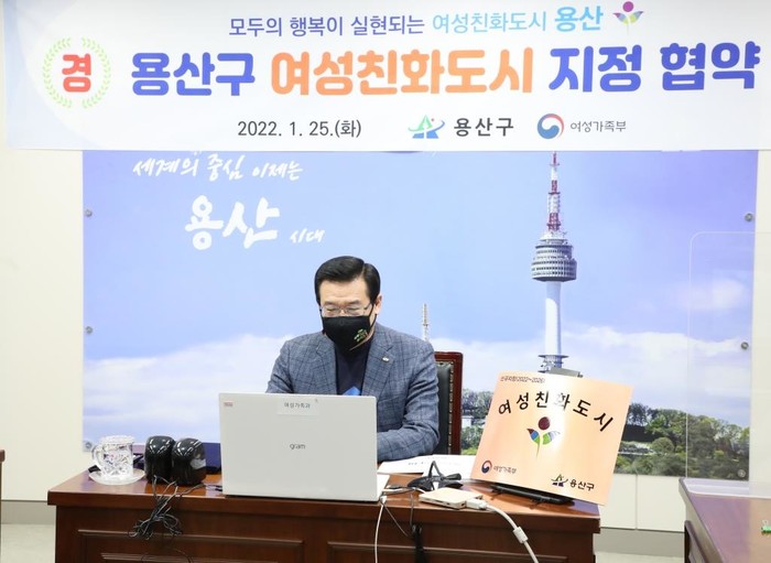 서울 용산구가 25일 여성가족부와 ‘여성친화도시’ 지정 협약을 비대면으로 진행했다. 구는 2021년 여성친화도시로 신규 지정돼 2022~2026년 5년간 ▲성평등 정책추진 기반 구축 ▲여성의 경제·사회 참여 확대 등을 추진할 계획이다. 사진은 성장현 구청장이 협약식을 진행하고 있는 모습. (사진제공=용산구청)