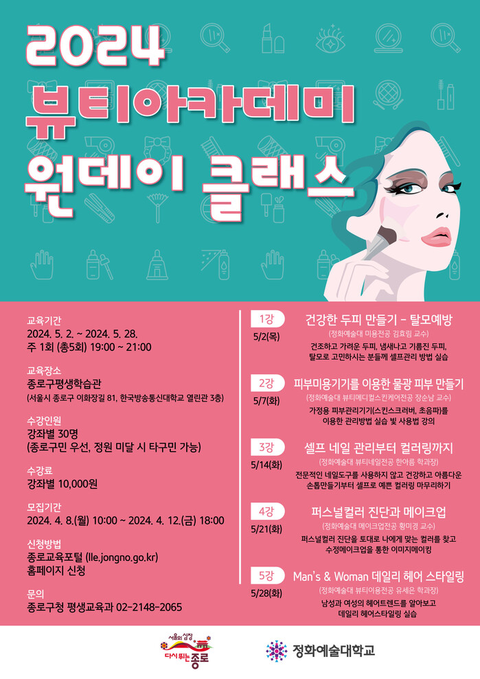 [시민일보 = 이대우 기자] 서울 종로구(구청장 정문헌)가 정화예술대학교와 손잡고 오는 5월 평생교육 프로그램 「뷰티 아카데미」를 진행한다.