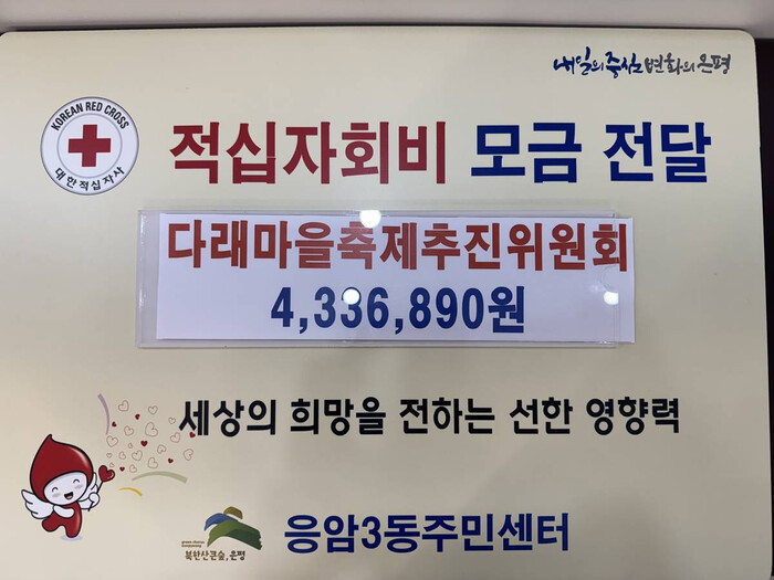 [시민일보 = 이대우 기자] 은평구(구청장 김미경) 응암3동은 지난 17일 다래마을축제추진위원회가 지역사회나눔 실천을 위한 적십자 특별회비 433만 원을 전달했다고 밝혔다.