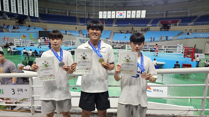 | ▲ 애향중(복싱마스터) 김태서(선수) 노철민(감독).(출처=전남도체육회 ) |