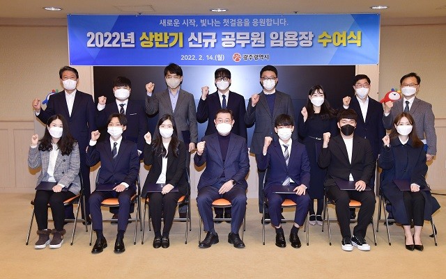 [광주=정찬남 기자] 이용섭 광주광역시장(앞줄 가운데)이 14일 오전 시청 비즈니스룸에서 열린 신규 공무원 임용장 수여식에 참석해 임용장을 전달한 뒤 기념촬영을 하고 있다. / 광주광역시 제공