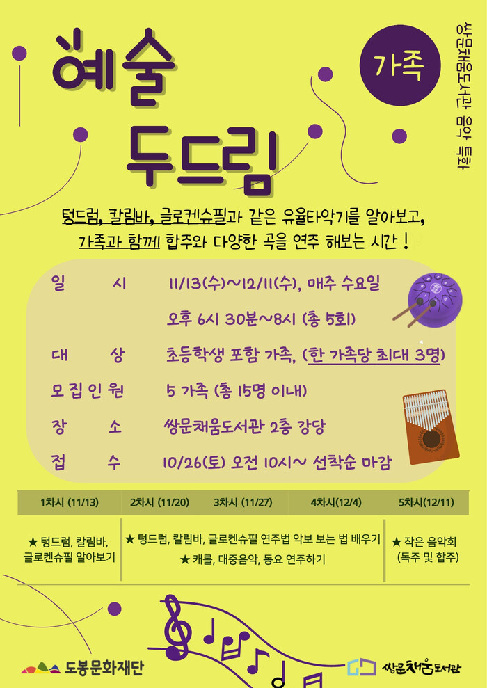 [시민일보 = 문민호 기자] 도봉구(구청장 오언석) 쌍문채움도서관은 12월까지 유율 타악기를 배우는 '예술 두드림'을 운영한다고 7일 밝혔다.