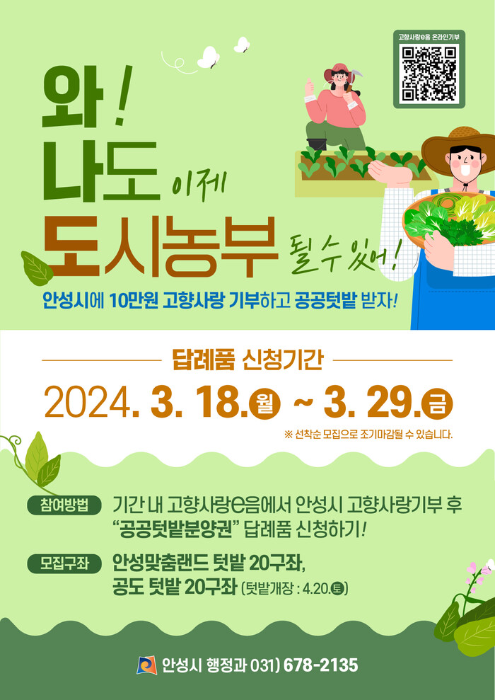 안성시에 10만원의 고향사랑 기부 후 텃밭 분양권을 답례품으로 선택하면 10㎡(3평) 크기의 텃밭을 추첨없이 분양받을 수 있다. 답례품은 선착순으로 3월 18일부터 제공된다.
