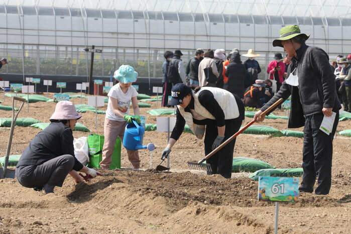 | ▲ 한 가족이 개장한 힐링텃밭에서 씨를 심고 물을 주고 있다. (사진=강남구청 제공) |