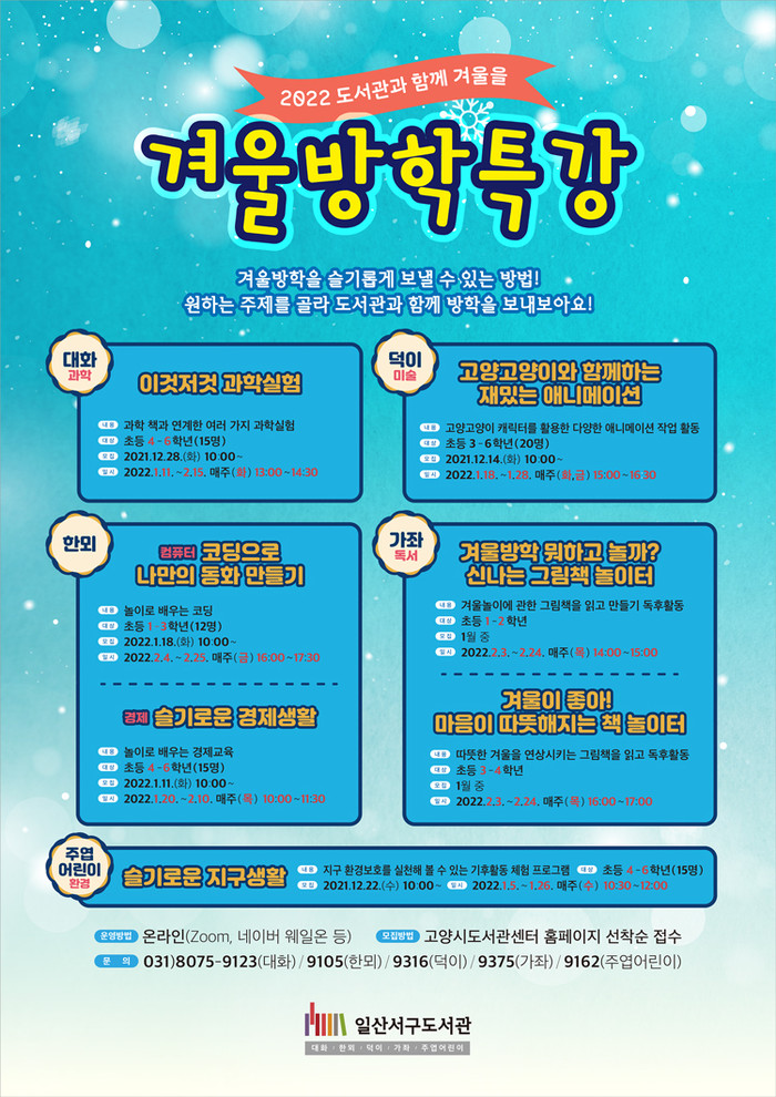 각 도서관별로 진행하는 프로그램은 ▲대화도서관 「이것저것 과학실험」 ▲ 한뫼도서관 「코딩으로 나만의 동화 만들기」, 「 슬기로운 경제생활」 ▲덕이도서관 「고양고양이와 함께하는 재밌는 애니메이션」 ▲가좌도서관 「겨울방학 뭐하고 놀까? 신나는 그림책 놀이터」, 「겨울이 좋아! 마음이 따뜻해지는 책 놀이터」 ▲주엽어린이도서관 「슬기로운 지구생활」이다.