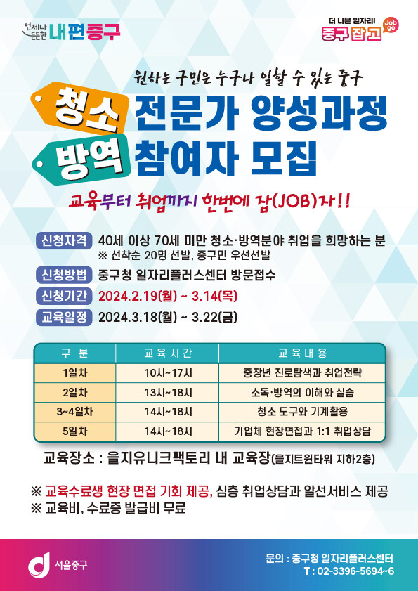 [시민일보 = 여영준 기자] 서울 중구(구청장 김길성)는 평소 구인‧구직 선호도가 높은 청소‧방역 분야의 효율적인 일자리 창출을 위해 '청소‧방역 전문가 양성과정'을 운영한다고 19일 밝혔다.