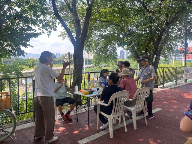 건강관리 서비스를 받아보신 어르신은 "요즘 날씨가 너무 더운데 제방길 그늘에서 산책하며 시원한 물도 마시고 이렇게 혈압이랑 혈당 측정도 해주니 좋다"라며 고마움을 표했다.