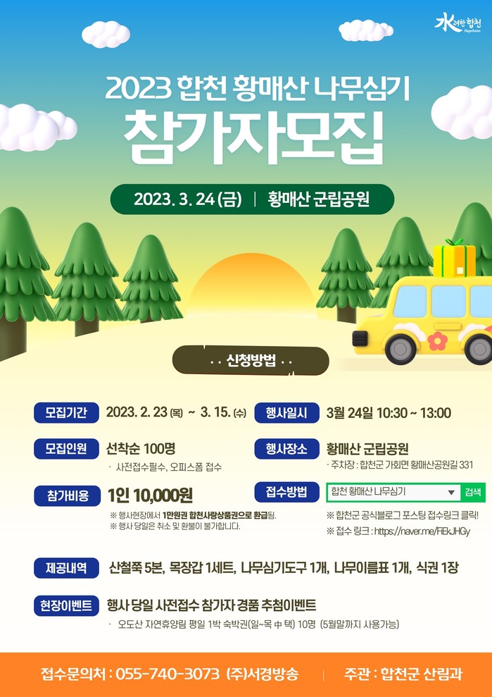 이번 행사는 황매산 사계절 힐링 관광지 조성을 위한 산철쭉 나무심기, 신규로 조성된 무장애 나눔길 걷기, 합천군 SNS 활성화 이벤트 행사로 진행할 예정이다. 또한 네이버에서 “합천 황매산 나무심기”를 검색해 합천군 공식블로그를 통해 유료로 신청 접수한 참가자에게는 현장에서 경품 추첨을 통해 오도산 휴양림 평일 1일 숙박권을 제공할 예정이다.