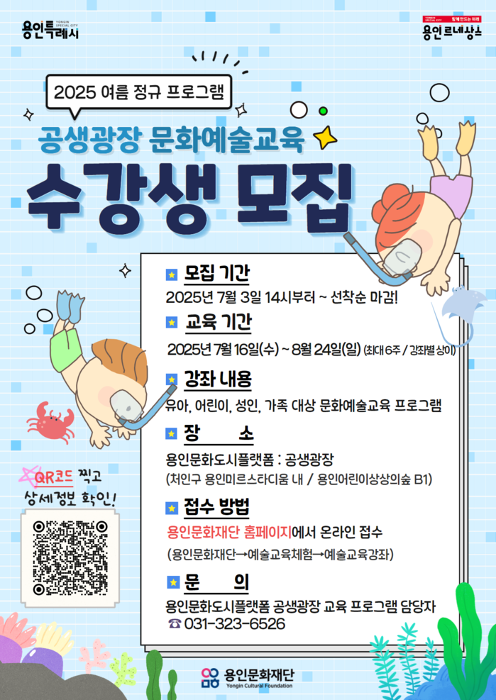 [용인=오왕석 기자] 용인문화재단(이사장 이상일)은 7월 3일(목)부터 ‘2025년 용인문화도시플랫폼 공생광장 문화예술교육 프로그램’의 여름 정규 강좌 수강생을 모집한다.