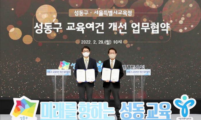 서울 성동구가 지난 28일 서울시교육청과 서울시 최초로 지역내 교육여건 개선을 위한 업무협약을 체결했다. 이번 협약을 통해 왕십리 뉴타운 지역과 금호동 지역의 중학교 설립 등을 중점적으로 추진한다. 사진은 협약식에서 정원오 구청장(왼쪽)과 조희연 교육감이 기념촬영을 하는 모습. (사진제공=성동구청)