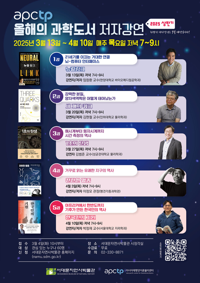 [시민일보 = 이대우 기자] 서대문자연사박물관과 아시아태평양이론물리센터(APCTP)가 3월 13일부터 4월 10일까지 매주 목요일 저녁 7~9시 박물관 시청각실에서 올해의 과학도서 저자강연을 개최한다.