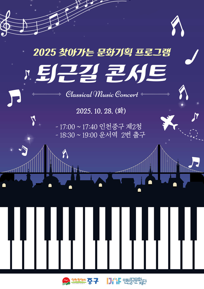 [인천=문찬식 기자] (재)인천중구문화재단(이사장 김정헌)은 오는 28일 저녁 퇴근길 시민들을 위한 특별한 문화 행사 ‘2025 영종 퇴근길 콘서트’를 개최한다.