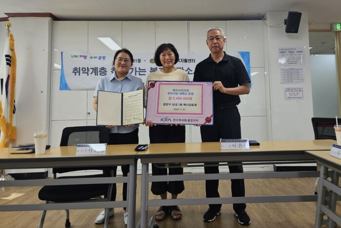중랑구 신내1동 주민센터가 최근 중랑유린지역자활센터와 ‘취약계층 주민을 위한 찾아가는 복지세탁소’ 사업 협약을 맺었다. ‘찾아가는 복지세탁소’ 사업은 취약계층 주민들의 쾌적한 생활환경 조성을 위해 마련됐으며, 1가구당 4만원 상당의 침구류 등 대형 세탁물 세탁 서비스를 총 60가구에 제공한다. 사진은 관계자들이 기념촬영을 하고 있는 모습. (사진=중랑구청 제공)