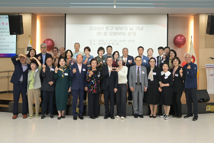 [시민일보 = 여영준 기자] 중구(구청장 김길성)가 지난 21일 부부의 날을 맞아 가정의 중심인 부부관계의 소중함을 되새기고 건강한 가족문화가 확산될 수 있도록 부부의 날 기념행사를 개최하고 모범부부 16쌍을 발굴해 표창했다.