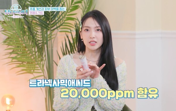 가수 강지영이 뷰티앤부티 시즌8에서 여름 햇빛에 손상된 피부를 환하게 밝혀주는 트라넥사믹 멜라 앰플, 트라넥사민 멜라 크림을 소개했다.
