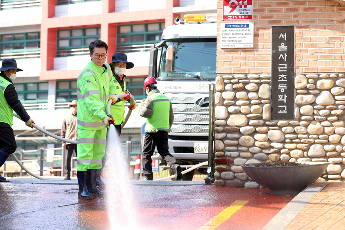 서울 성동구가 최근 지역내 초·중·고 학생들에게 새학기를 맞아 쾌적하게 등교할 수 있도록 27개 초·중·고 학교 통학로 물청소를 실시했다. 사진은 청소 작업에 참여한 정원오 구청장이 통학로 보도 및 차도를 고압수로 세척하는 모습. (사진=성동구청 제공)