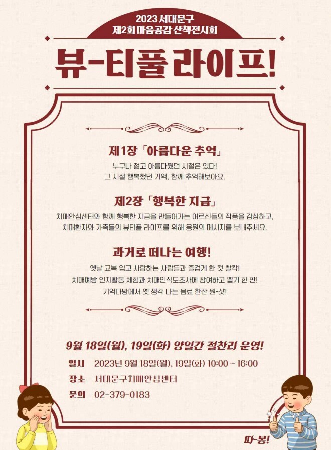 [시민일보 = 홍덕표 기자] 서울 서대문구치매안심센터가 2023년 치매극복의 날(매년 9월 21일)을 기념해 오는 18일과 19일 서대문구보건소 별관 우리들 2층 강당에서 제2회 마음공감 산책전시회를 개최한다.