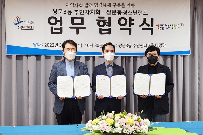 | ▲ 쌍문3동주민센터-쌍문3동주민자치회-쌍문동청소년랜드 협약식(2022. 3. 23. 쌍문3동 주민센터)(왼쪽부터 쌍문3동 주민자치회장 정충길, 쌍문3동장 백순석, 쌍문동청소년랜드 센터장 김성아) (사진제공=도봉구청) |