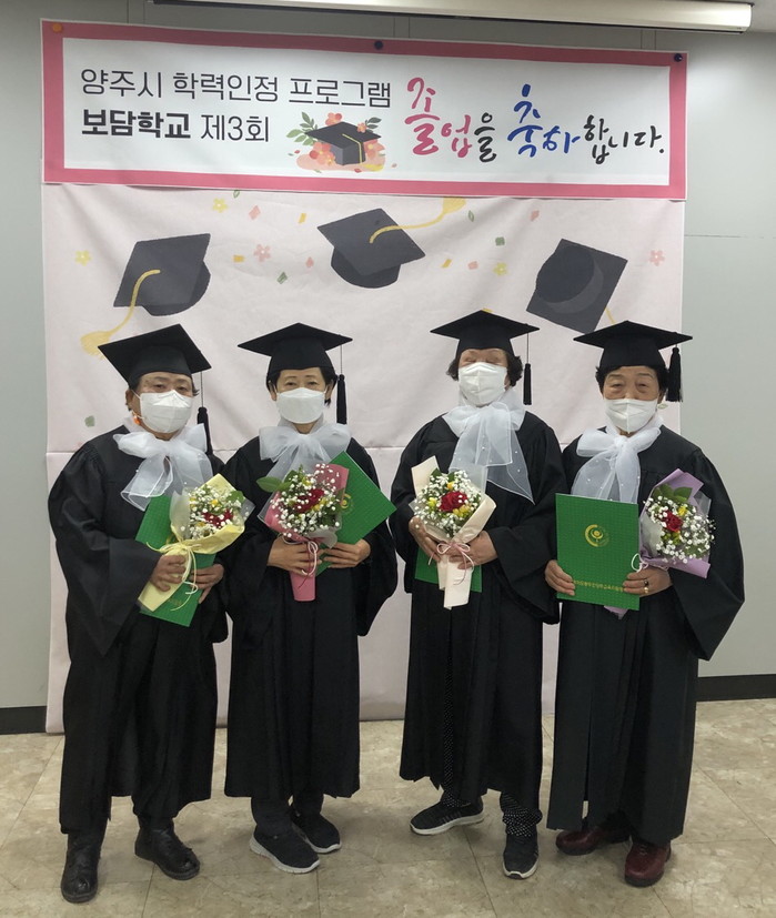 경기 양주시는 23일 '제3회 보담학교 졸업식'을 열고 총 7명의 학생에게 초등 교육과정 졸업장을 수여했다. 보담학교는 저학력·비문해 성인을 대상으로 교육과정을 통해 초등학력 인정 문해교육기관이다. 사진은 이날 졸업생들이 기념촬영을 하는 모습. (사진제공=양주시청)