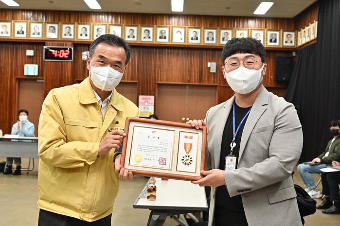 경기 여주시가 지난 9일 코로나19로 어려운 교육환경 속에서 학생들이 양질의 학교 교육을 받을 수 있도록 노력한 노고를 치하하기 위해 교사를 비롯해 교육행정 주무관교육자 등 학교 관계자 25명을 대상으로 지역인재 양성 기여 감사장을 수여했다. 사진은 이날 이항진 시장(왼쪽)이 감사패를 전달하고 있는 모습. (사진제공=여주시청)