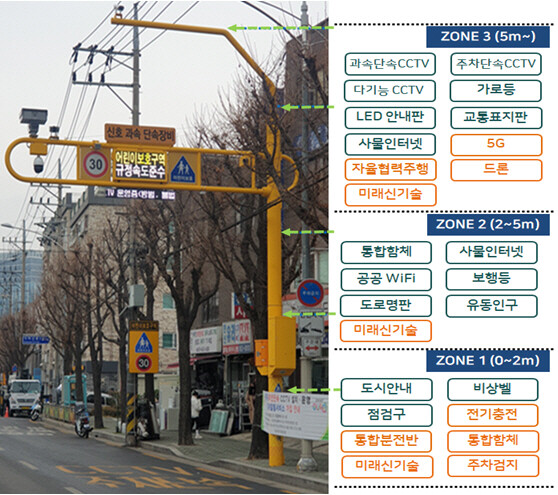 스마트폴이란 기존에 개별적으로 설치됐던 가로등, 전신주 등 기둥과 지능형 CCTV, 공공 와이파이, 스마트 횡단보도, 과속 CCTV, 미세먼지 및 유동인구 센서(S-DoT) 등을 하나로 통합해 탑재시킨 도시기반시설이다.